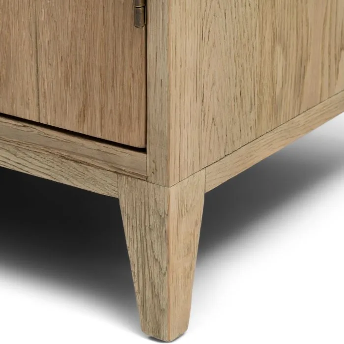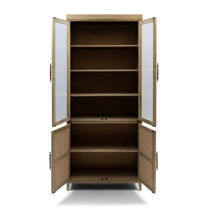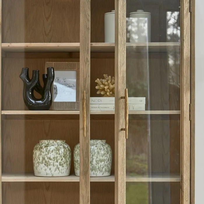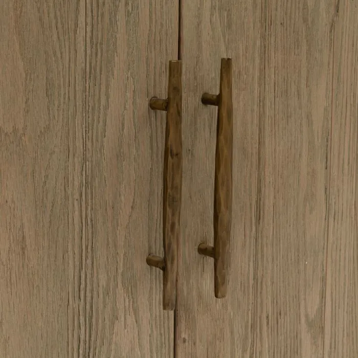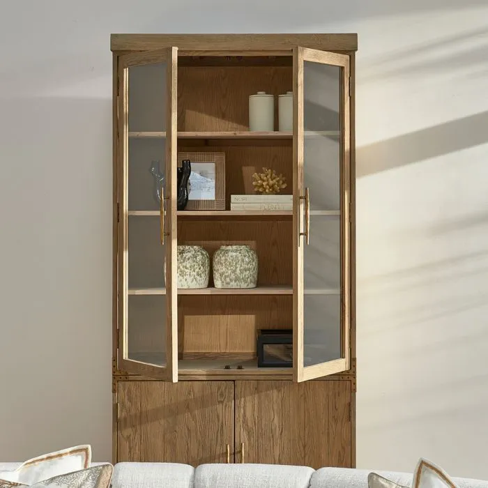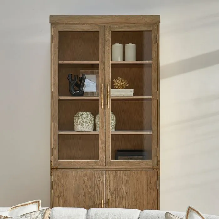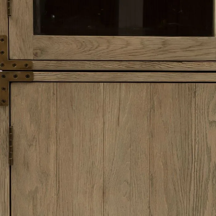 Bei dieser schönen Vitrine handelt es sich um die Brescia, eine große Vitrine, die vollständig aus wiederverwendetem Eichenholz mit einer hellen Oberfläche hergestellt wurde. Der Schrank besteht aus zwei Teilen, einem Teil mit zwei geschlossenen Türen und einem oberen Teil mit Türen aus Sicherheitsglas. Die Ausführung ist mit einer goldenen Verkleidung an den Ecken und markanten Griffen versehen.