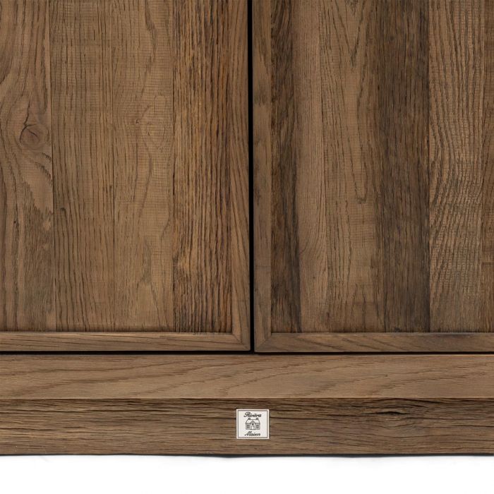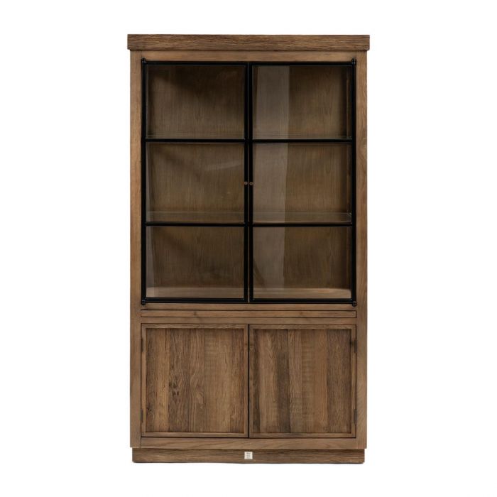 Der Clearwater Creek Schrank ist ein Beleg für die Möglichkeiten der nachhaltigen Produktion, denn dieser Schrank ist aus recycelter Alteiche gefertigt. Der Schrank ist einteilig, jedoch mit Schranktüren unten und einer Platte mit Glastüren in einem stabilen, schwarzen Metallrahmen ausgestattet.Unter dem Metallrahmen befindet sich ein Regal, das ausgezogen und als Schreibtisch verwendet werden kann.