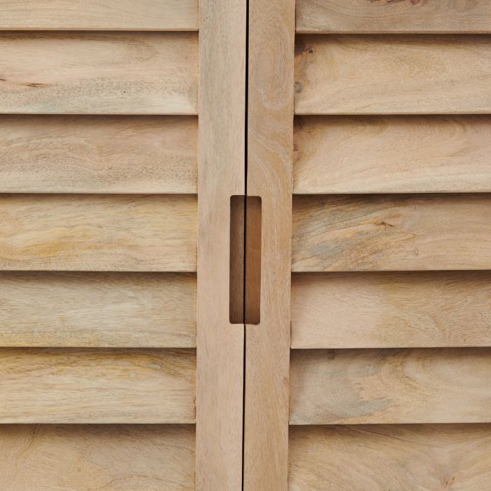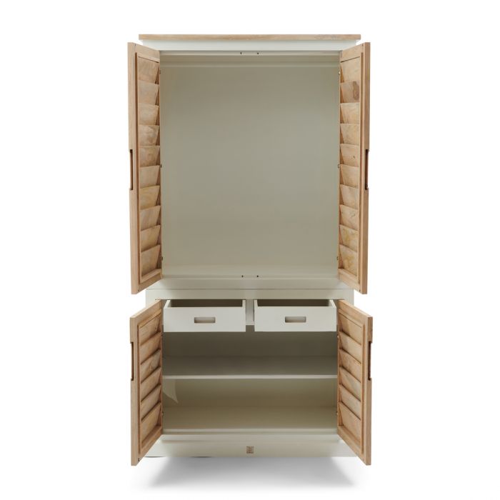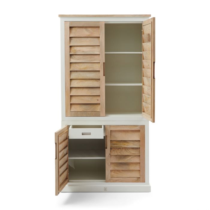 Dies ist der Kleiderschrank aus der Pacifica-Serie, einer Serie von auffallend schönen Möbeln aus weiß lackiertem Holz und naturfarbenem Mangoholz. Das Schöne an diesem Schrank ist, dass er neben der Möglichkeit, Kleidung liegend zu verstauen, auch einen geräumigen Hängebereich hat. Auch bei diesem Schrank schließen die Türen mit einer sanften Softclose-Technik. In dieser Serie sind verschiedene Möbel erhältlich.