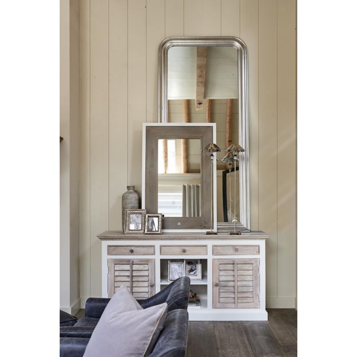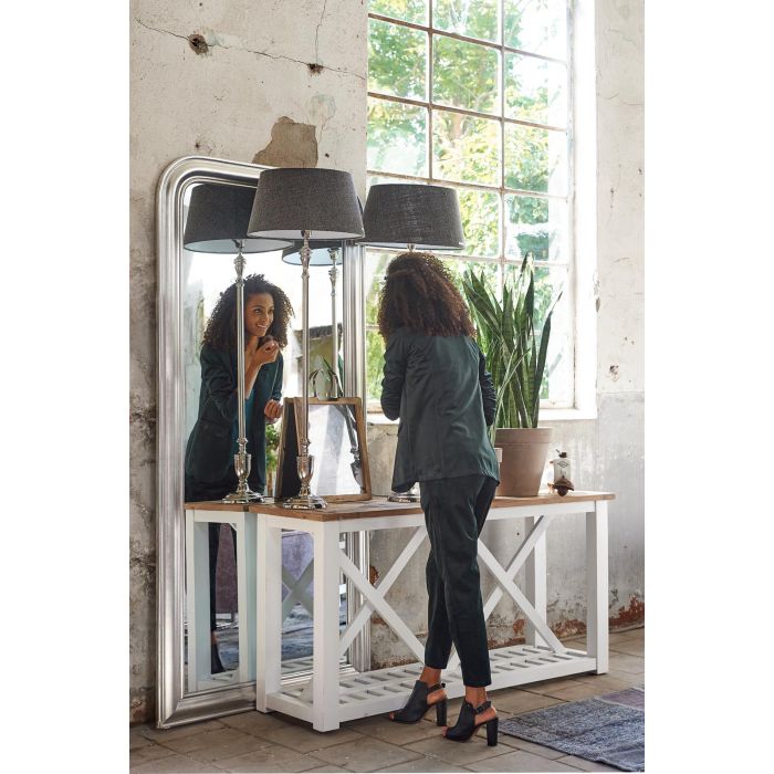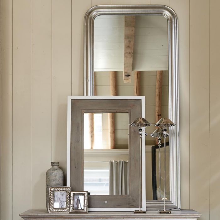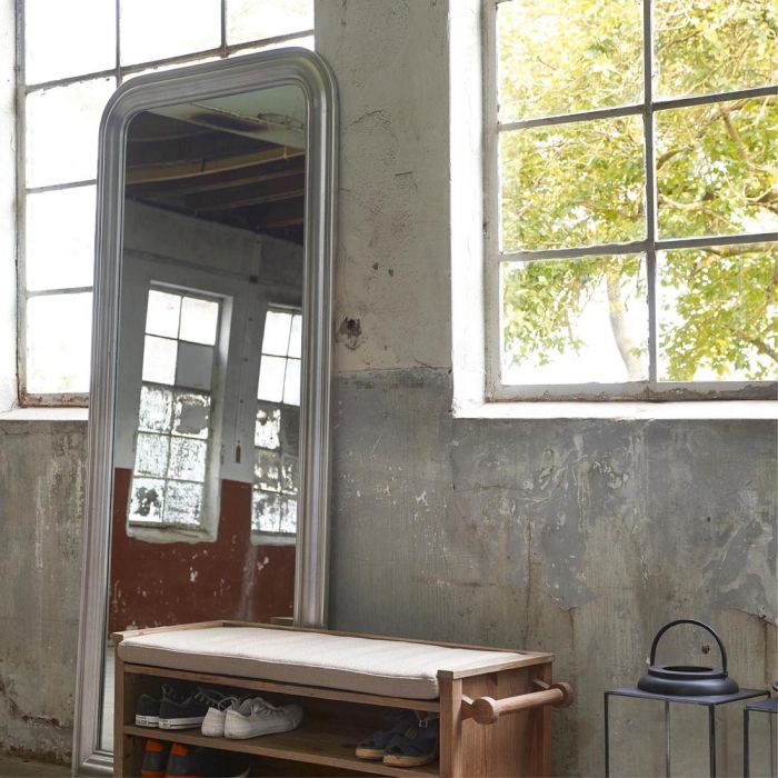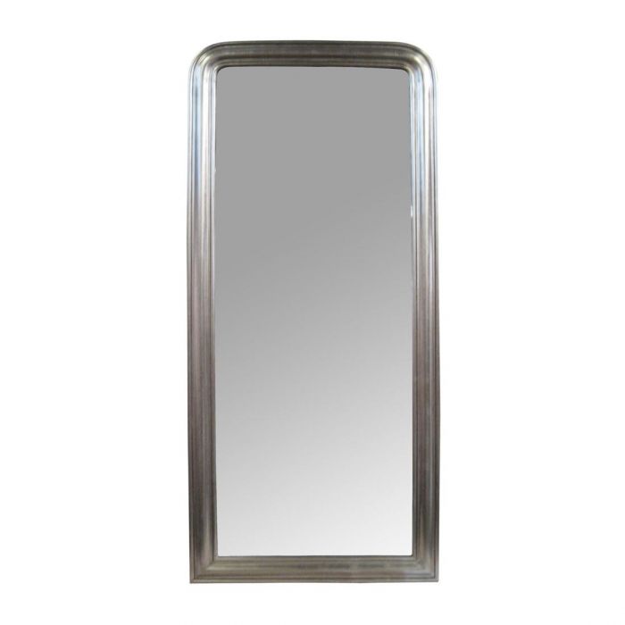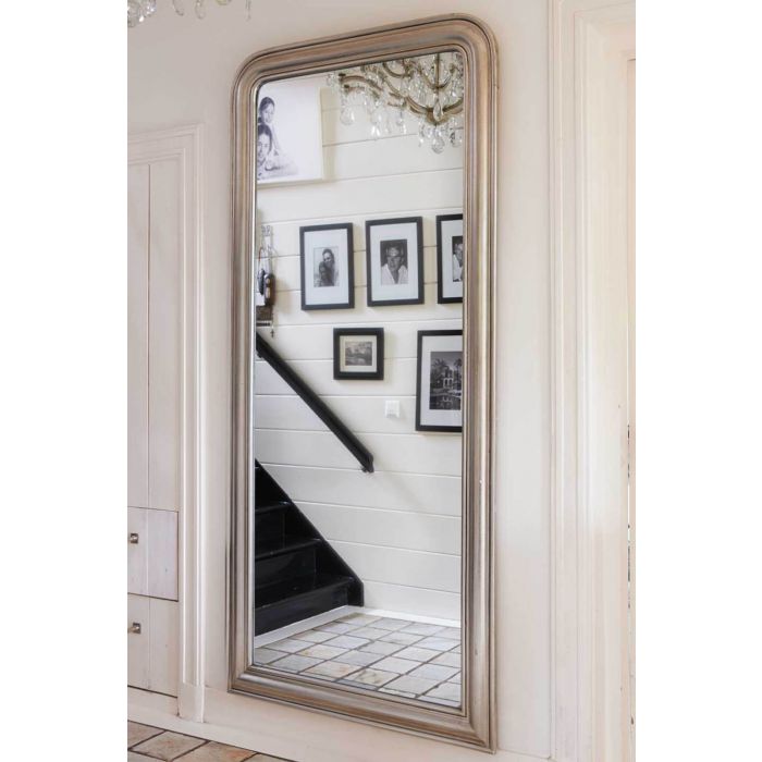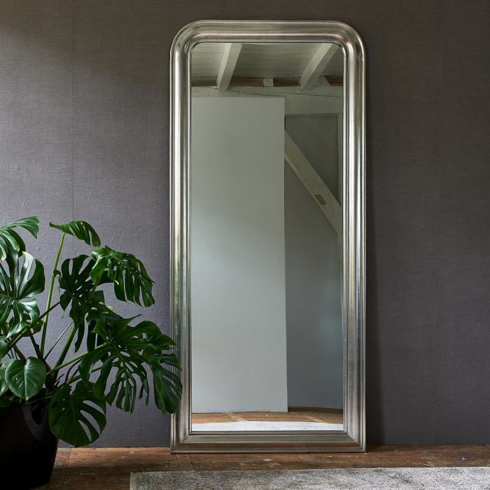 Großer Ganzkörperspiegel mit silberfarbenem Holzrahmen.
