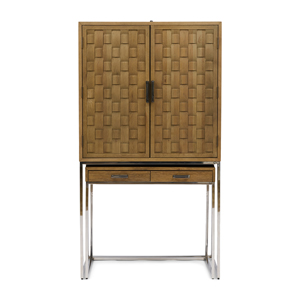 Dieser Hängeschrank auf hohen Beinen hat einen Rahmen aus Edelstahl und Metallgriffe. Die Türen aus aufgearbeiteter Eiche sehen aus, als wären sie handgeflochten und verleihen dem Schrank einen einzigartigen Look. Im Inneren findest du drei geräumige Fächer und vier kleinere Fächer hinter zwei weiteren Türen sowie eine Ablage für Weingläser und einen Magnetverschluss für zusätzlichen Komfort. Ein passendes Sideboard mit zwei Schubladen kann unter den Barschrank gestellt werden, um einen einheitlichen Look zu erzielen, oder separat verwendet werden, um den gleichen Stil im ganzen Raum widerzuspiegeln.