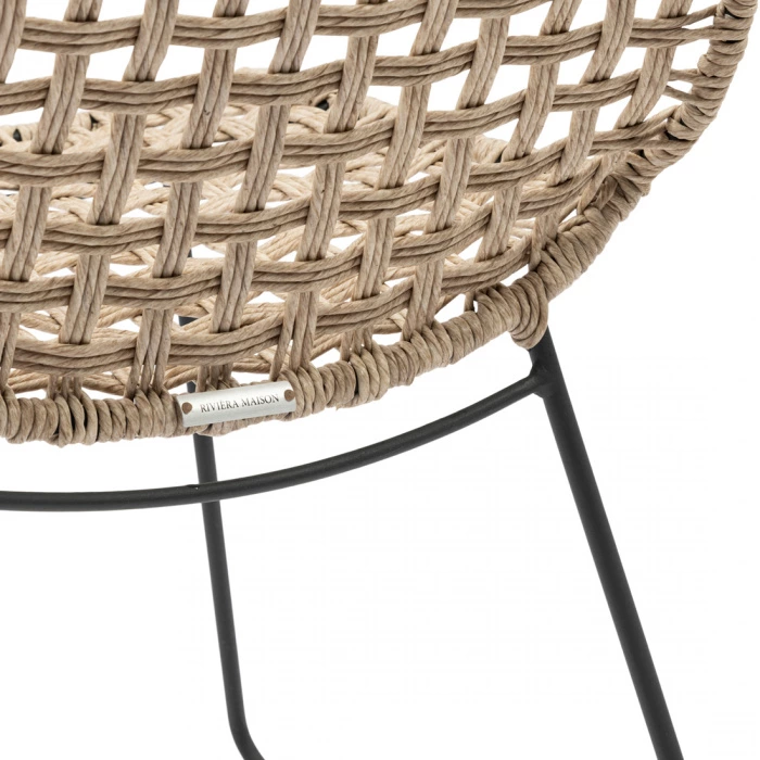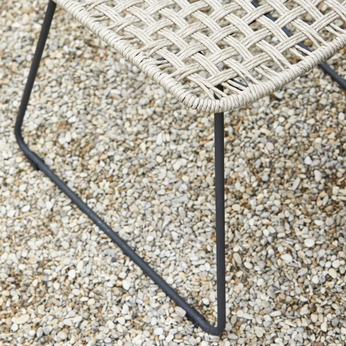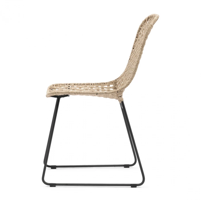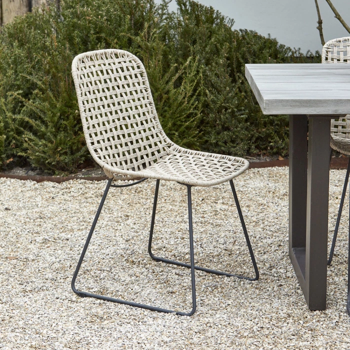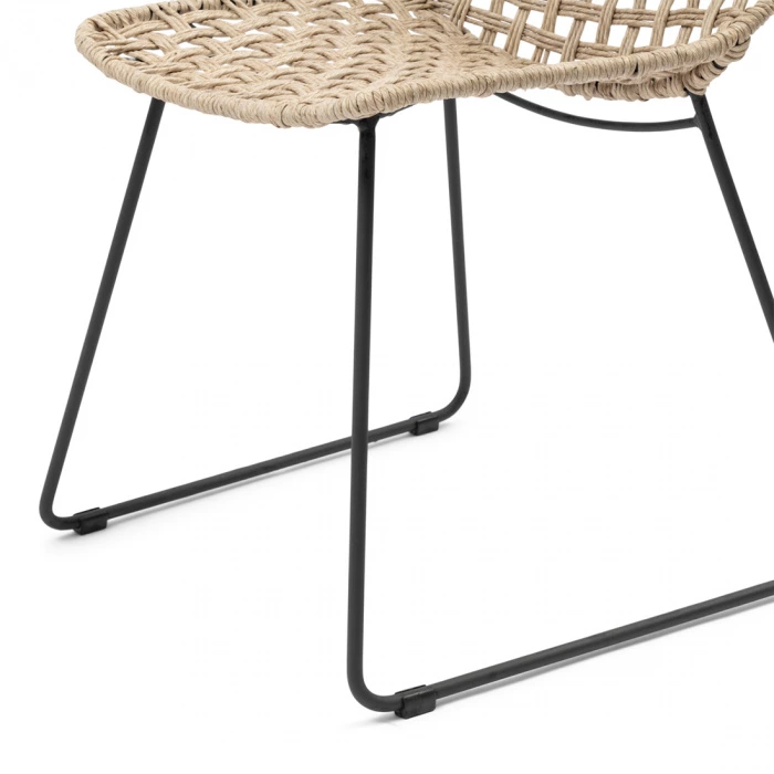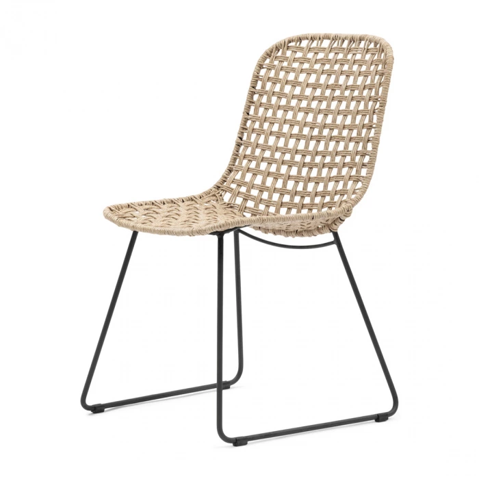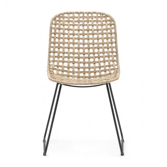Ganzjährig draußen sitzen? Das können Sie mit den Außenmöbeln der Serie Jakarta, wie diesem schönen Esszimmerstuhl. Der Stuhl steht auf einem offenen Gestell aus dünnem, schwarzem Metallrohr, das stabil, aber sehr luftig wirkt. Sitz und Rückenlehne haben ein durchbrochenes Muster mit Karos aus Weidengeflecht. Dieses schöne Material ist absolut witterungsbeständig und hat das Aussehen von natürlichem Rattan.