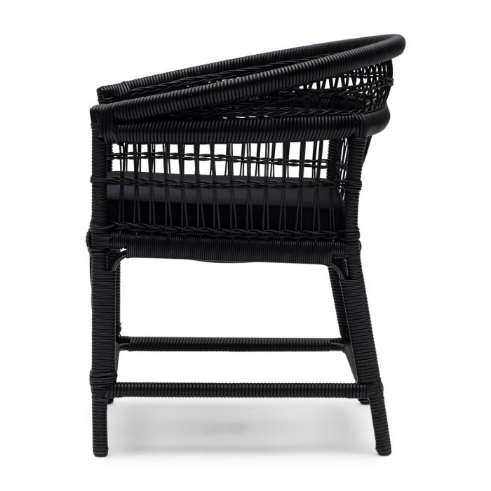 Eleganter Stuhl für luxuriösen Sitzkomfort im Garten, auf der Terrasse oder dem Balkon. Aus wetterbeständigem Weidengeflecht gefertigt, das um einen stabilen Aluminiumrahmen gewickelt ist. Das Stuhl-Kissen ist mit einem komfortablen Baumwollbezug ausgeführt. Der Stuhl ist an seinen Beinen mit vier zusätzlichen Streben versehen, die seine Stabilität erhöhen.