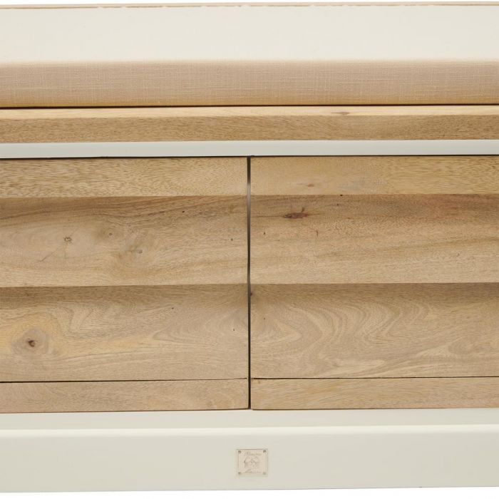 Eine multifunktionelle Bank, handgefertigt aus nachhaltigem Mangoholz. Der Mangobaum wird erst gefällt, wenn er keine Früchte mehr trägt. Dadurch erhält der Baum ein zweites Leben, zum Beispiel in der Möbelindustrie. Die Polsterung dieser Bank ist aus Baumwolle. Die Bank bietet Stauraum.
