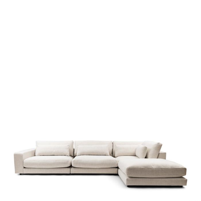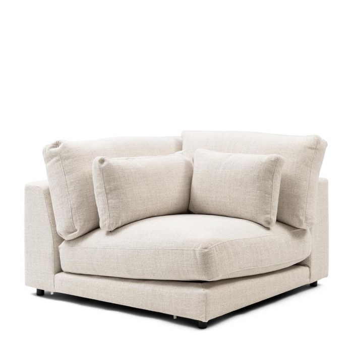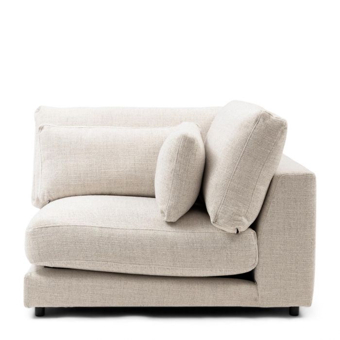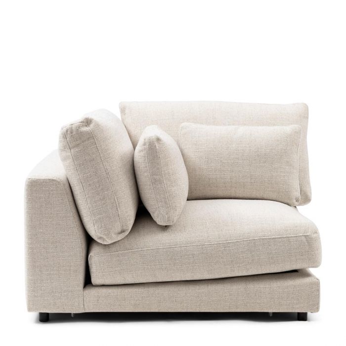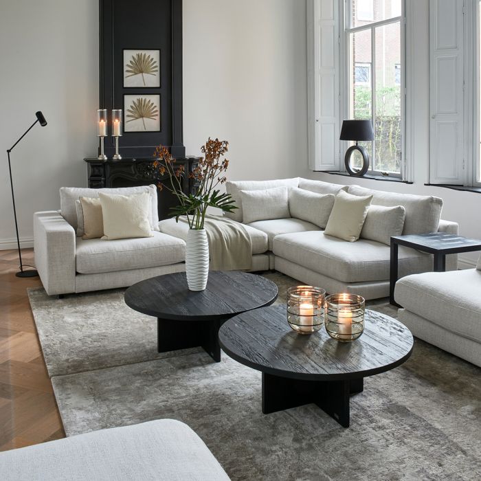 Es handelt sich um eine Eckbank aus der modularen Sofaserie Stephen. Da es sich um ein Eckstück handelt, haben beide Rückenlehnen die gleiche Höhe, sodass Sie einfach ein weiteres Element heranschieben können. Aber natürlich kann diese tiefe, niedrige Bank auch separat im Raum aufgestellt werden.