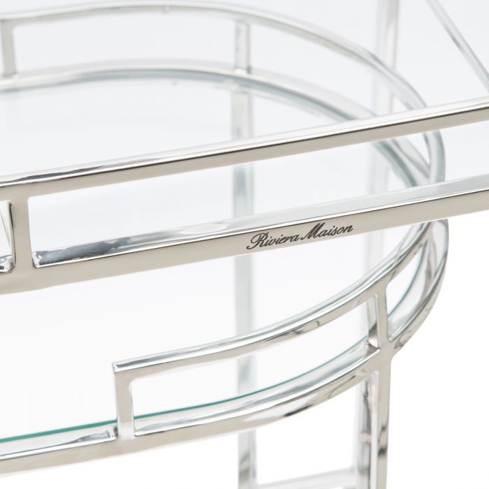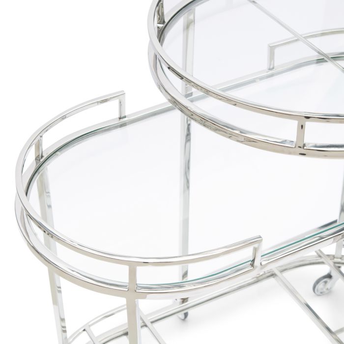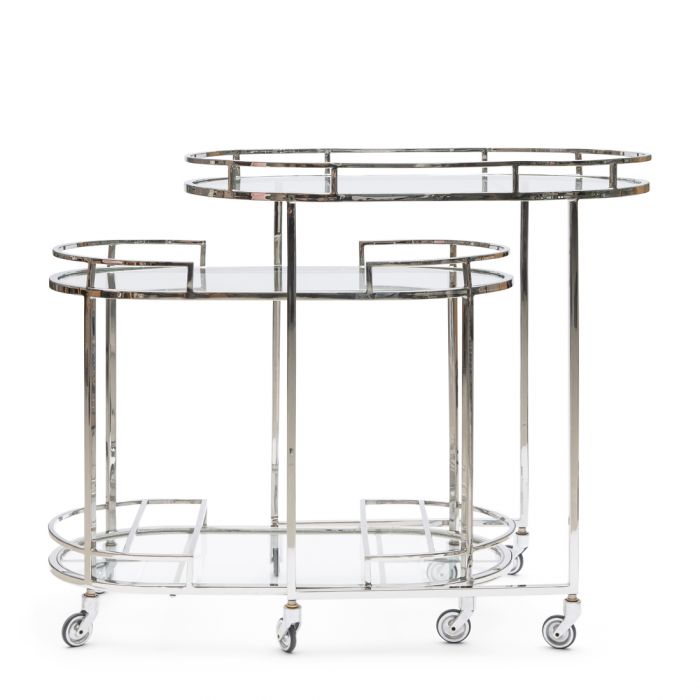 Das Crosby Street Bar Cart ist ein edles Set aus zwei Beistelltischen, die wunderbar in ein glamouröses Loft passen. Präsentieren Sie Ihre feinsten Gläser, Karaffen und besten Getränke auf diesen Tischen mit ovalen Glasplatten und erhöhtem Rand. Beide Tische haben Räder, sodass Sie die Tische problemlos übereinander stellen oder mit einer kleinen Erfrischung zu Ihren Gästen schieben können. Das Gestell der Beistelltische besteht aus Edelstahl.