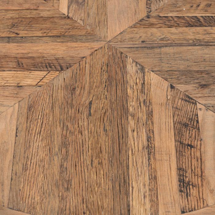 Der Falcon Crest Couchtisch mit einem Durchmesser von 100 cm ist ein runder Tisch mit einer Platte aus recycelter Eiche mit Intarsien in Form eines Kreuzes. Unter dem industriellen Couchtisch befindet sich ein Eisengestell, das ebenfalls eine gekreuzte Form hat. Der Tisch ist 40 cm hoch.