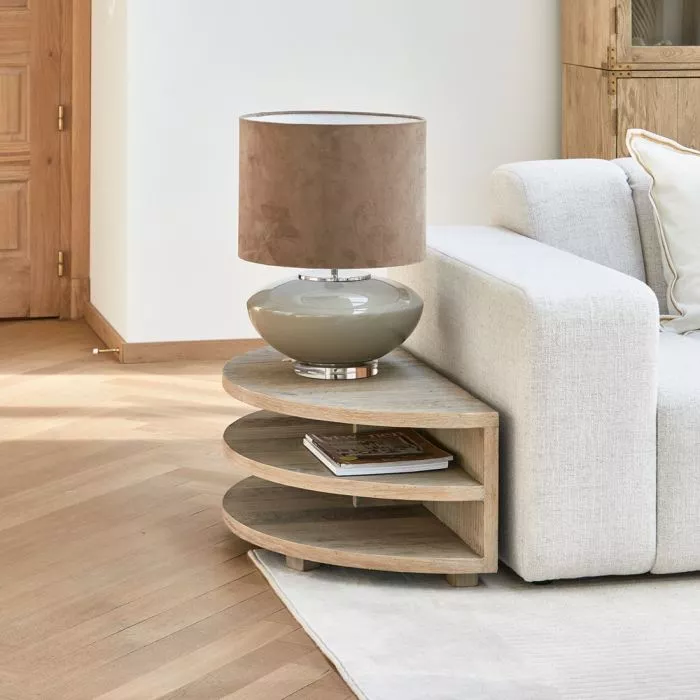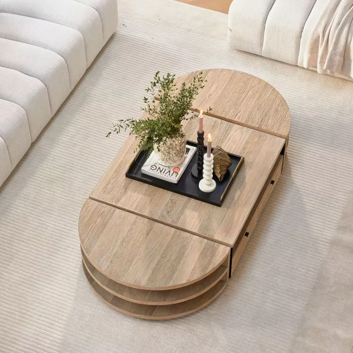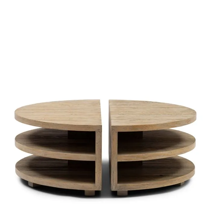 Dies ist das Milan Couchtisch-Set, das aus zwei separaten Tischen besteht, die Sie entweder einzeln oder zusammen verwenden können. Die Tische bestehen aus drei halbkreisförmigen Platten, die fast zu schweben scheinen, aber in einer geschlossenen Rückwand zusammenlaufen. Das Couchtisch-Set besteht aus eingelegtem Eichenholz mit einer hellen Lackierung. Erhältlich in verschiedenen Versionen.