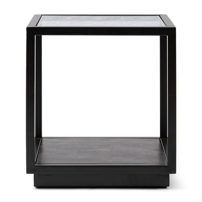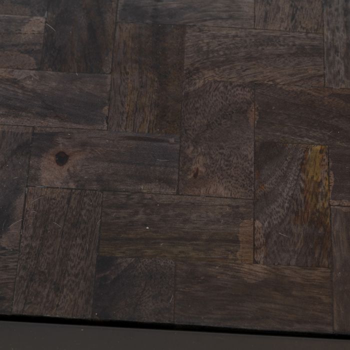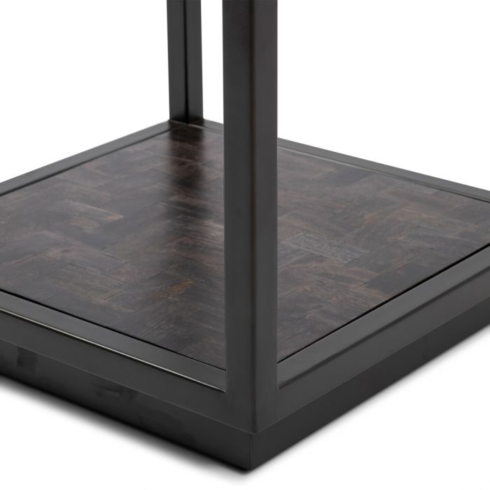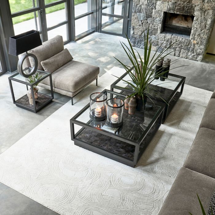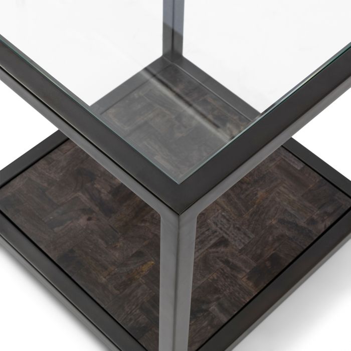 Schlicht und doch elegant, das ist der Roger-Beistelltisch. Dieser Beistelltisch hat eine größere Fläche und zwei Platten. Die Oberseite besteht aus robustem Sicherheitsglas und die Unterseite aus warmem, grauem Mangoholz. Beide Platten fallen in einen schwarzen Metallrahmen.