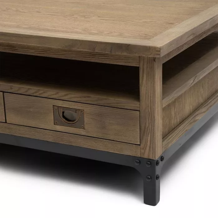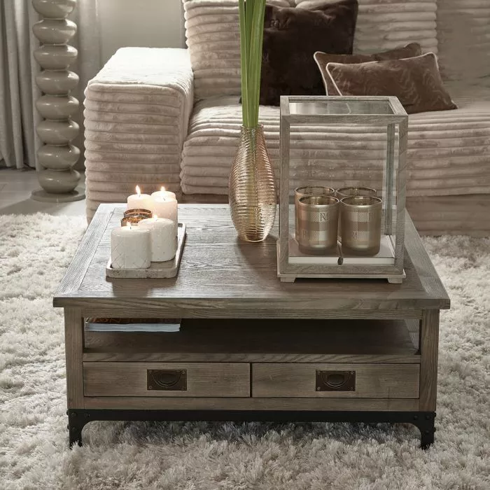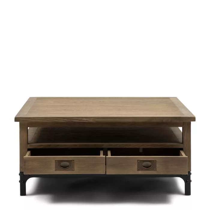 Der robuste und doch raffinierte Couchtisch The Hoxton. Aus recyceltem Eschenholz und Eisen gefertigt, strahlt dieser Tisch einen dauerhaften Charme aus. Aber er hat noch mehr zu bieten als nur sein Aussehen. Mit vier praktischen Schubladen und einer Trennwand bietet dieser Tisch viel Stauraum. Werten Sie Ihr Wohnzimmer mit diesem 90x90 cm großen Couchtisch auf und genießen Sie die Mischung aus Stil und Funktionalität. Kombinieren Sie ihn mit anderen Möbeln der Serie Hoxton.
